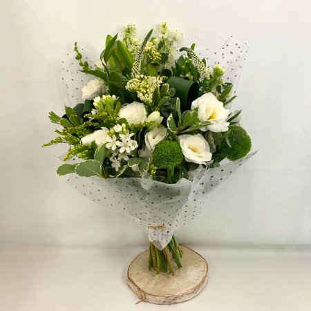 פרחים לבנים וירק מיוחד. זר עטוף בנייר קוריאני