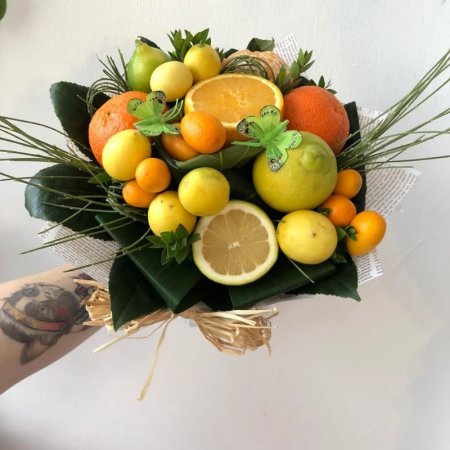 זר אכיל בצבעים חמים עשוי ממגוון פירות הדר.
